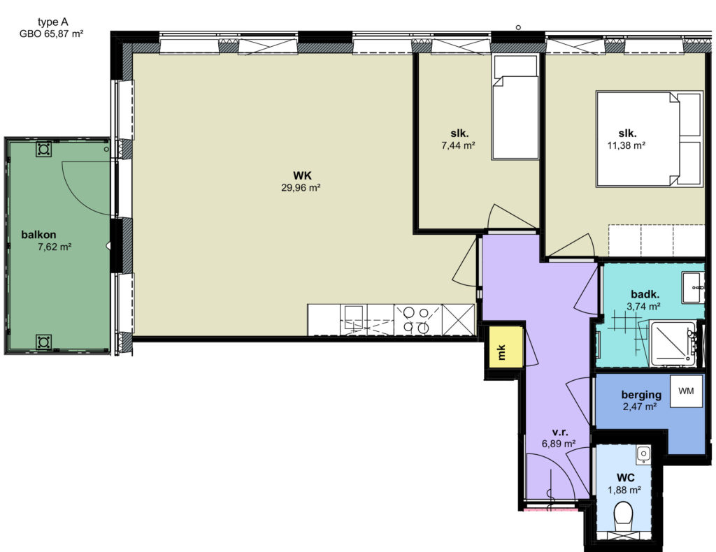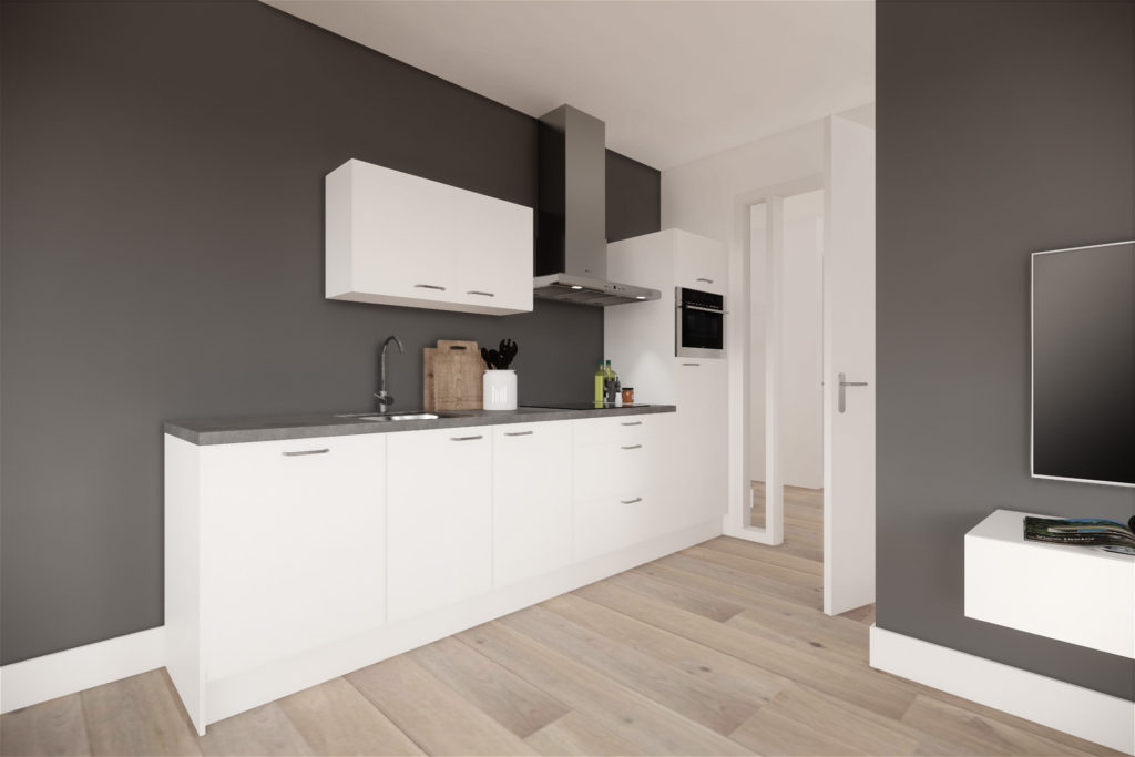 Ruime woonkamer met open keuken en toegang tot het balkon of tuin. De luxe keuken, in rechte opstelling, is voorzien van diverse inbouwapparatuur. Twee slaapkamers,  badkamer met wastafel en inloopdouche, separaat toilet,  berging met aansluiting voor de wasmachine en parkeerplaats op het omliggende terrein.